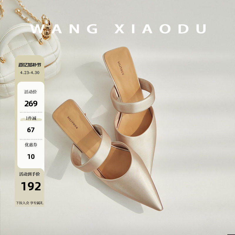 【王小毒】香槟假日●6.5cm真丝尖包头凉拖鞋女高跟一字带穆勒拖