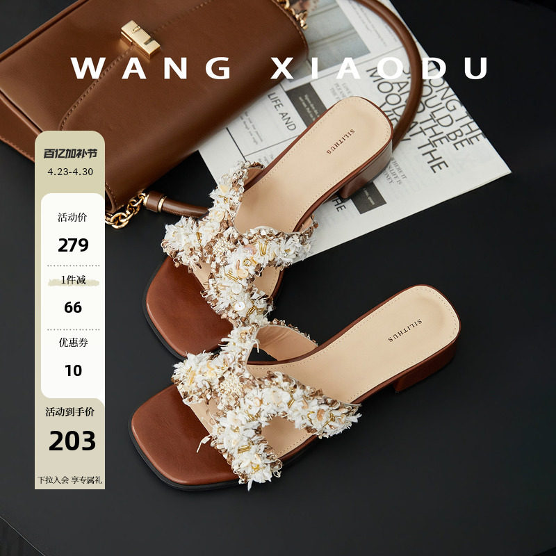 原创【王小毒】香风H拖●3.5cm粗跟花呢珍珠一字凉拖鞋女外穿露趾