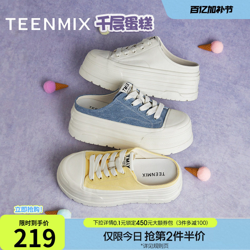 天美意千层蛋糕增高厚底帆布包头半拖鞋女外穿凉拖小白鞋新款