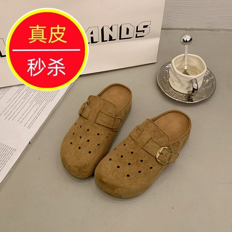 真皮厚底勃肯包头半拖鞋女2026夏季外穿镂空透气反绒皮一脚蹬凉拖