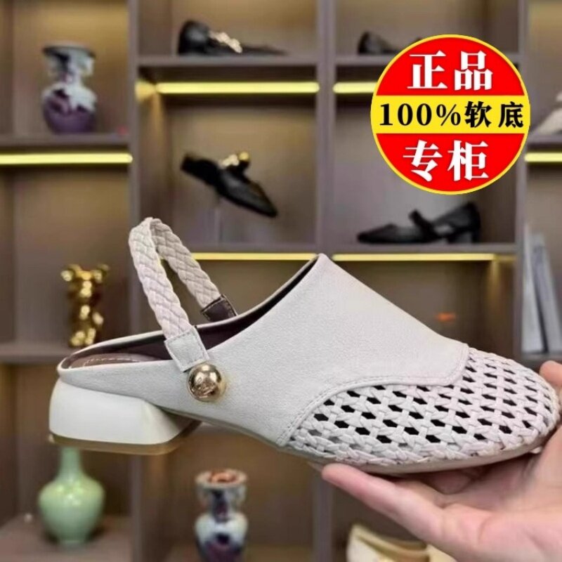 品牌真皮软皮包头半拖鞋女夏外穿2026款厚底粗跟镂空编织女凉拖鞋