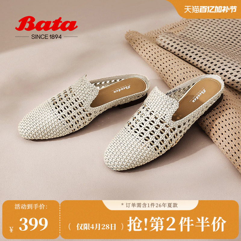 Bata包头拖鞋女商场新款英伦软底编织外穿穆勒鞋AVL43AH5