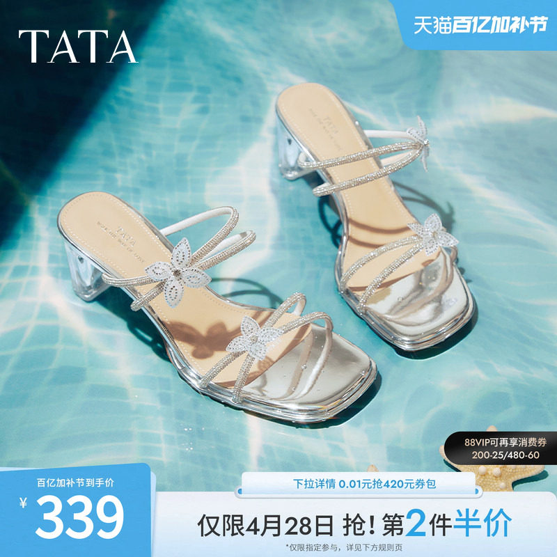 TATA他她仙女系列法式水钻高跟拖鞋女鞋气质透明底凉拖XEK04BT5