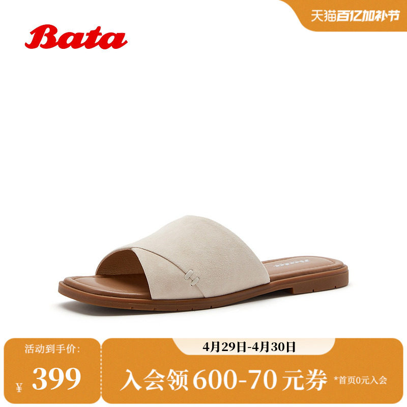 Bata一字拖女2026夏季新款轻便居家外穿舒适软底羊皮拖鞋ARP39BT6