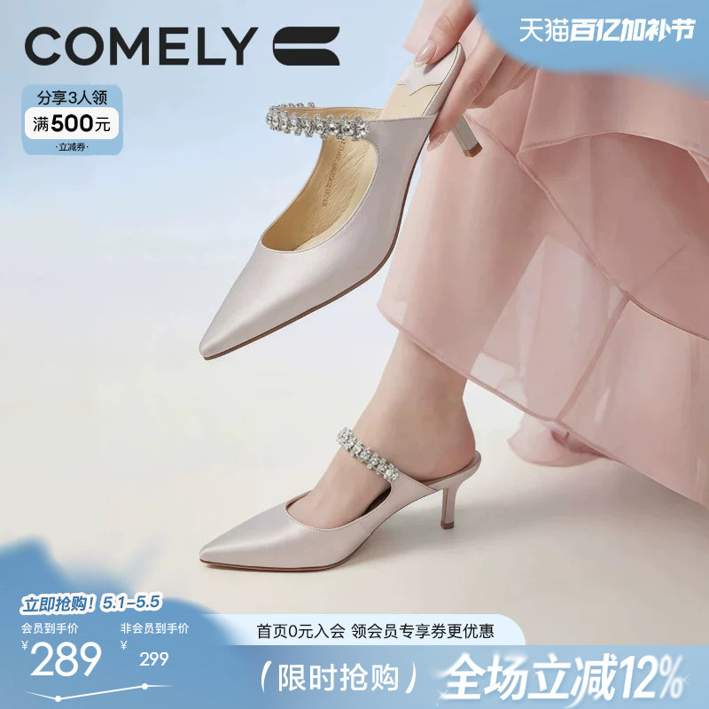 时装周同款康莉穆勒鞋女细跟春夏新款丝缎高跟法式包头半拖鞋