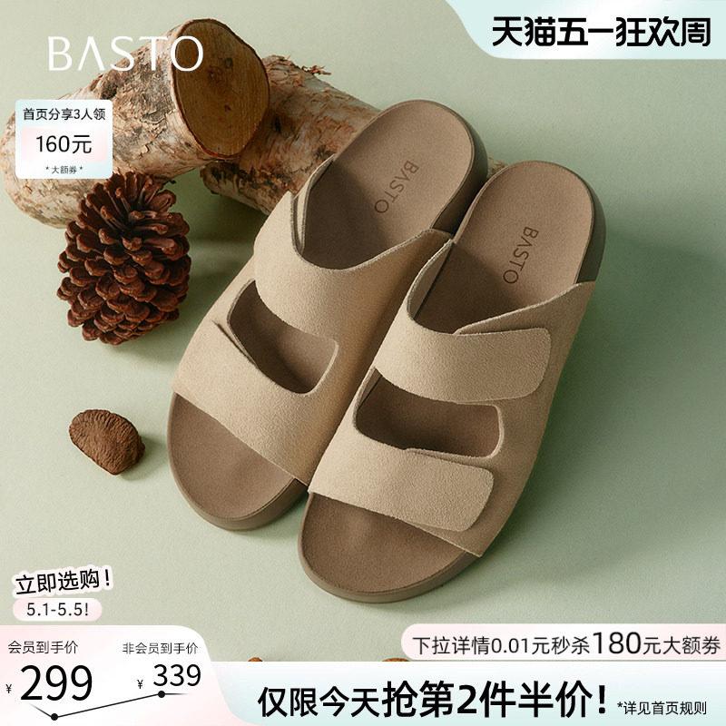 百思图夏新款时尚通勤舒适羊皮一字拖平底外穿女凉拖鞋TY414BT5