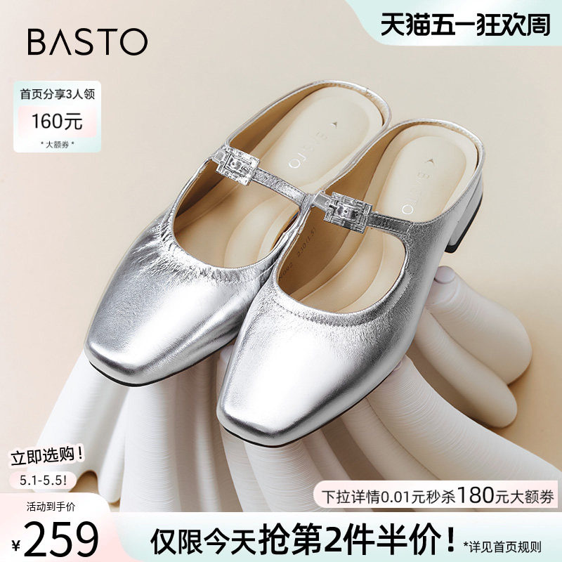 百思图夏商场新款休闲一脚蹬穆勒拖半拖粗跟女凉拖鞋BN092BH4
