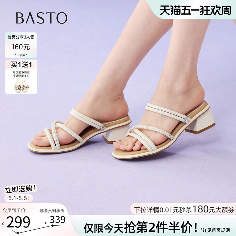 百思图2026夏新款时尚通勤圆头粗跟条带露趾凉鞋拖鞋女鞋O7989BT6