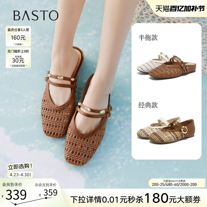 百思图2026夏季商场新款镂空编织玛丽珍穆勒拖外穿女拖鞋F1520BH6