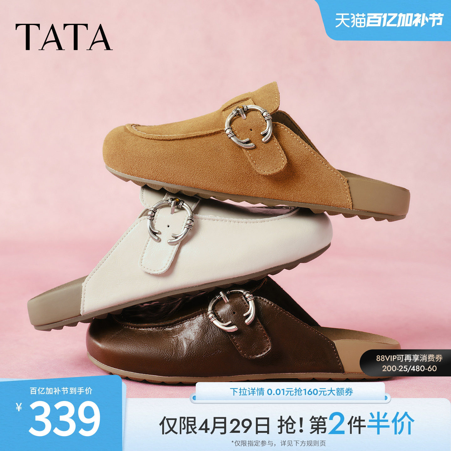 TATA他她奶油卷半拖鞋女平底包头拖鞋女羊皮穆勒鞋新款YDT05BH5