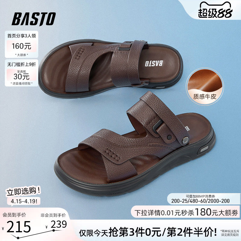 百思图夏季商场同款牛皮男士凉鞋外穿拖鞋爸爸中年皮凉鞋W2915BL6