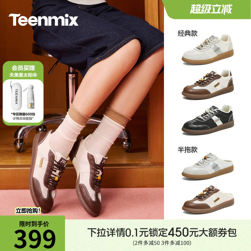 天美意薄底网面透气阿甘德训鞋运动板鞋女包头半拖鞋2026夏季新款