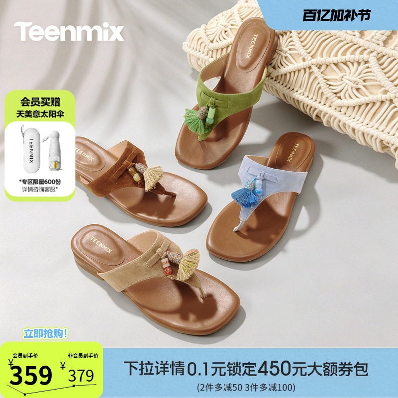 天美意人字拖复古绒面夹趾平底拖鞋女海边度假凉拖鞋2026夏季新款