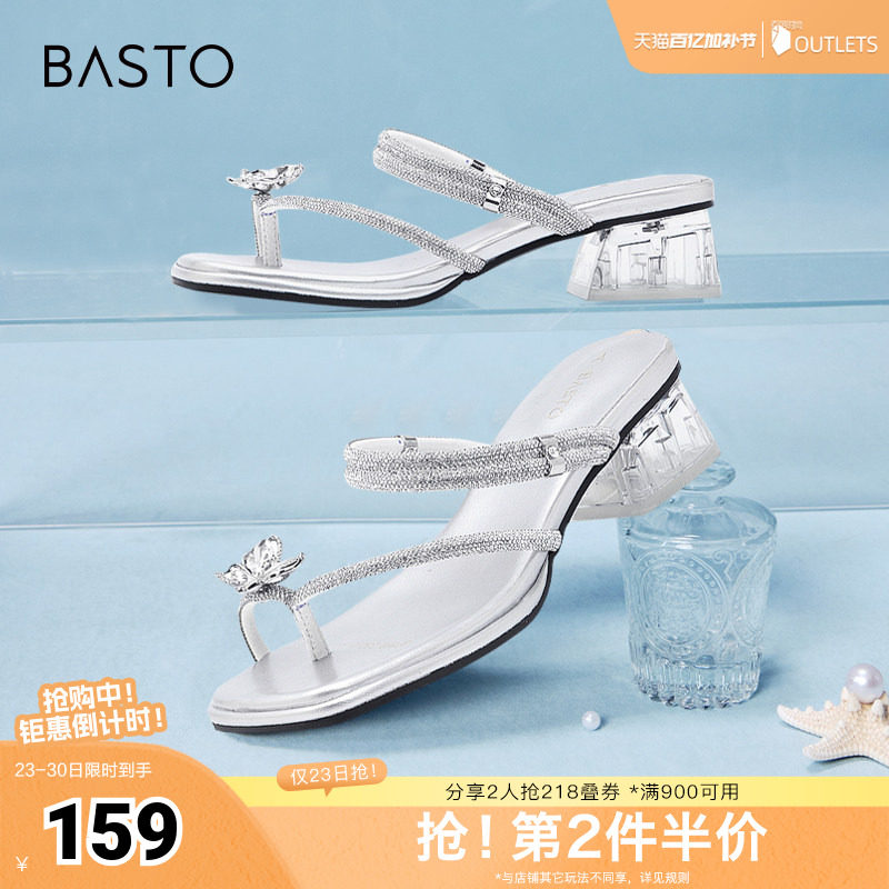 百思图春夏季新款商场同款时尚简约潮流粗跟女拖鞋BP569BT4