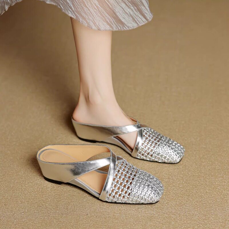 银色编织镂空包头穆勒鞋女夏外穿一脚蹬方头内增高半拖鞋休闲凉拖