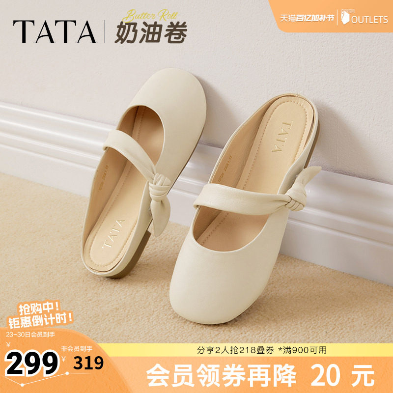 TATA他她奶油卷半拖鞋女平底包头拖鞋女羊皮穆勒鞋新款YDT05BH5