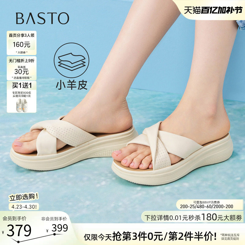 百思图26夏商场新款厚底户外露趾凉拖休闲女外穿羊皮拖鞋CS320BT6