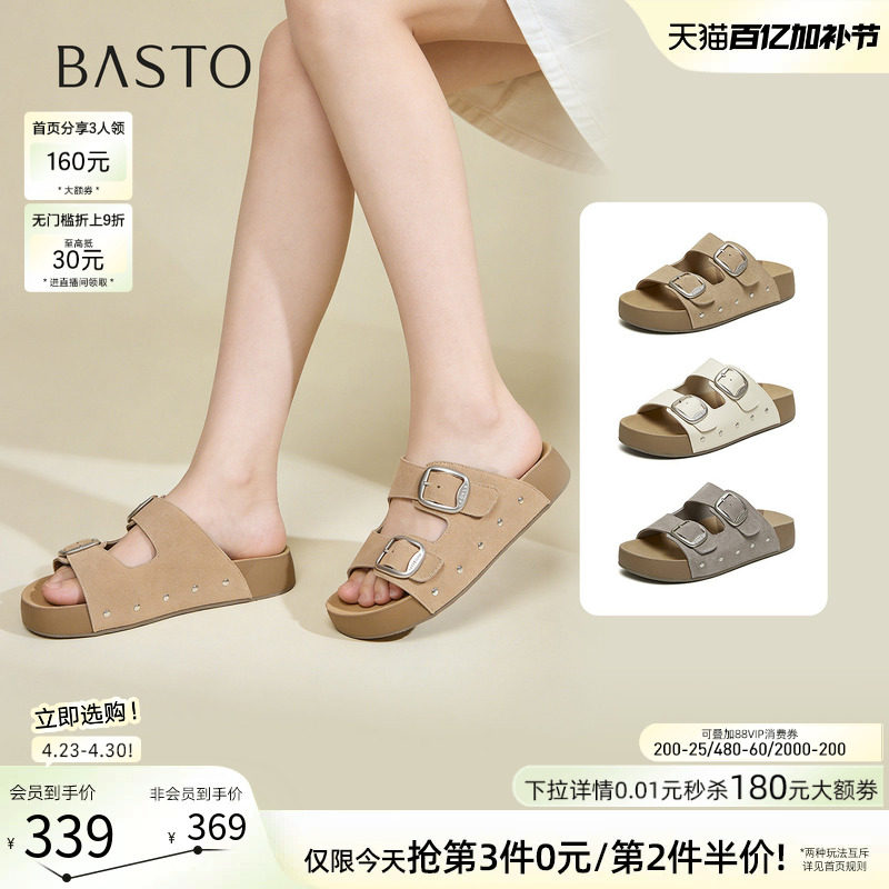 百思图2026夏商场新款真皮厚底勃肯鞋休闲外穿露趾女拖鞋T1858BT6