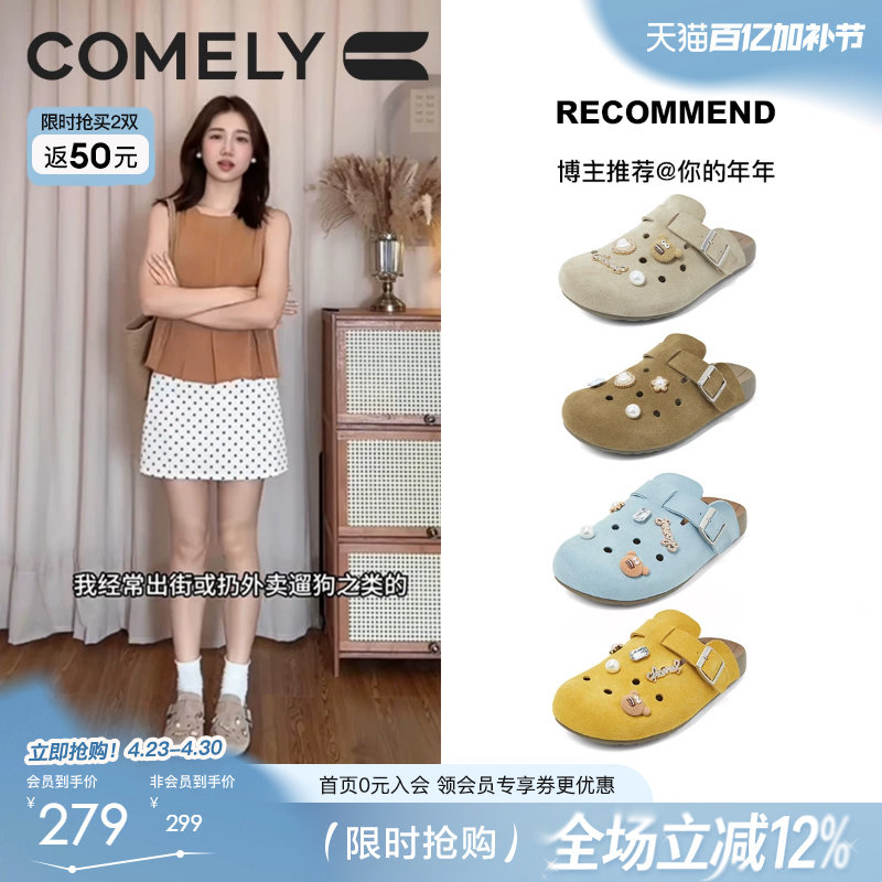 千百度薄底一脚蹬勃肯鞋包头拖女新款舒适复古平底半拖鞋气质百搭