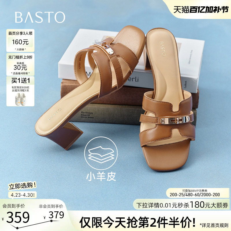 百思图2026夏季商场新款粗高跟一字拖羊皮外穿女凉拖鞋C7321BT6