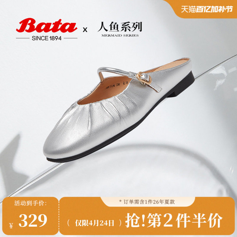 Bata人鱼玛丽珍拖鞋女春秋羊皮软底一脚蹬半拖凉鞋ART14AH4