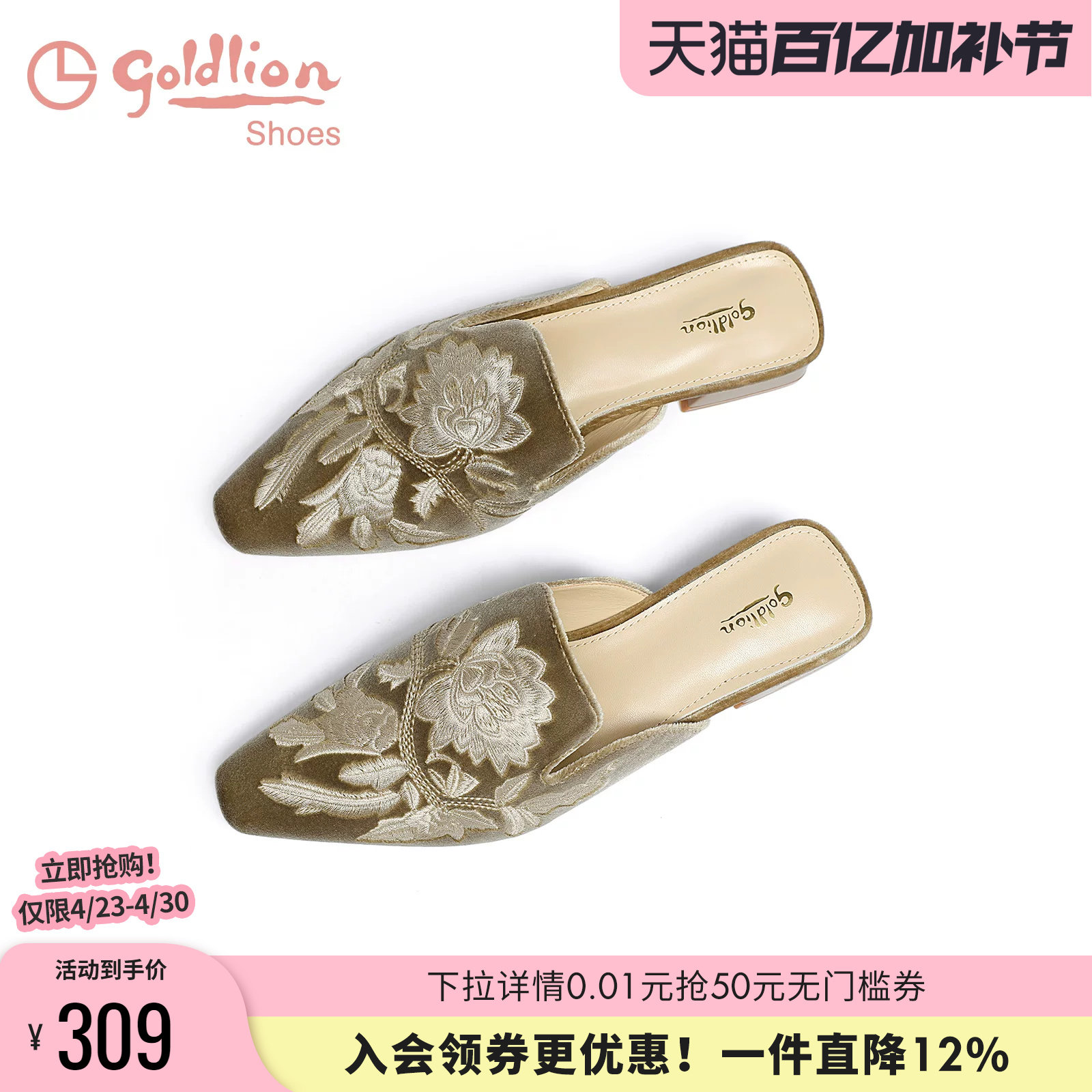 金利来女鞋2025春夏新款新中式刺绣花包头半拖鞋女外穿低跟穆勒鞋