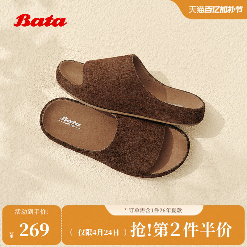 Bata外穿拖鞋女秋商场新款牛剖皮百搭厚底一字凉拖鞋AUH08CT5