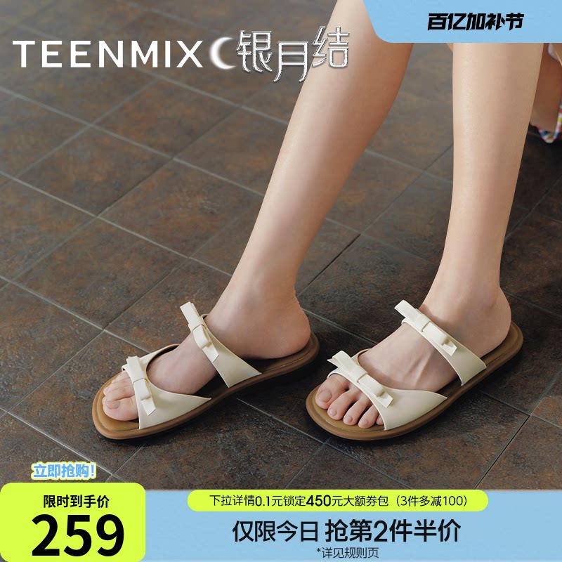 天美意银月结一字拖蝴蝶结平底拖鞋女鞋子外穿休闲凉鞋夏季新款
