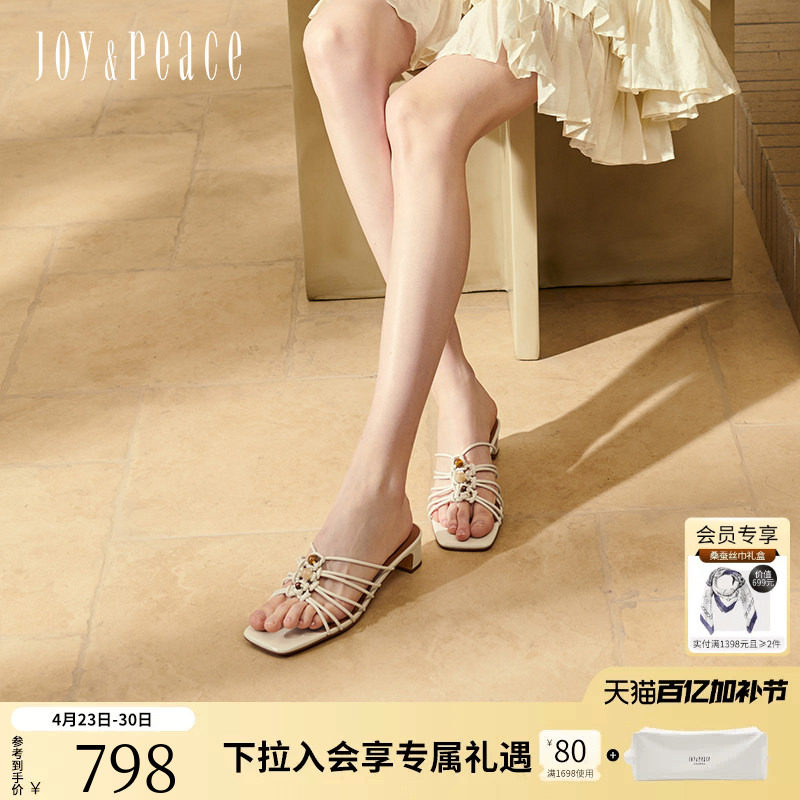 董洁同款真美诗圣托里尼夏季新款串珠镂空编织粗跟凉鞋拖鞋女