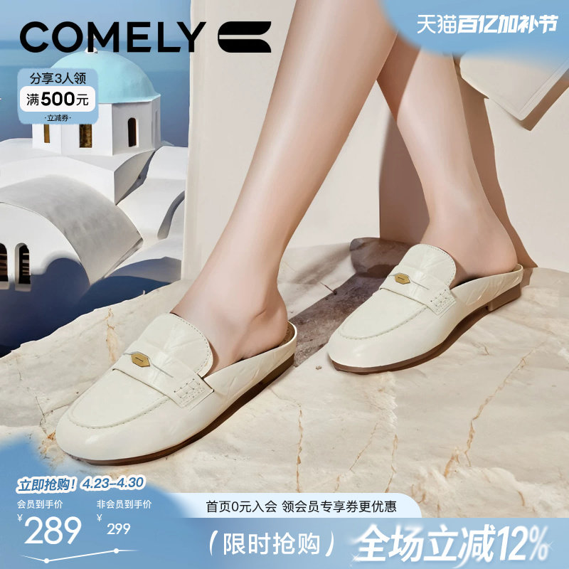 康莉真皮包头半拖鞋女春夏新款圆头幸运金币扣乐福鞋低跟穆勒鞋