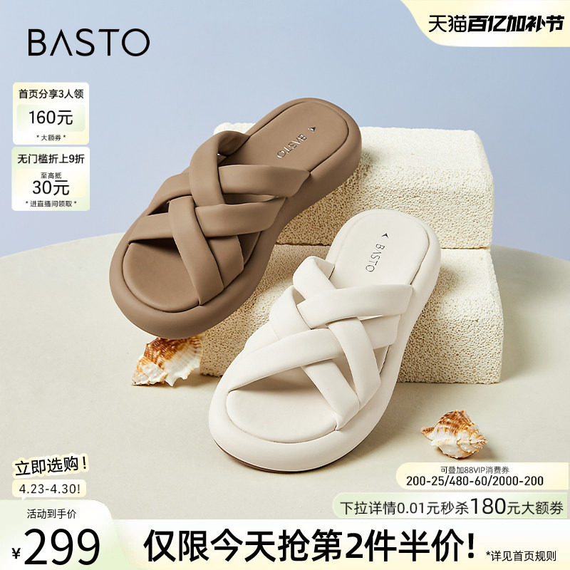 百思图夏季商场新款休闲舒适平底居家外穿女拖鞋彭彭拖TX601BT4