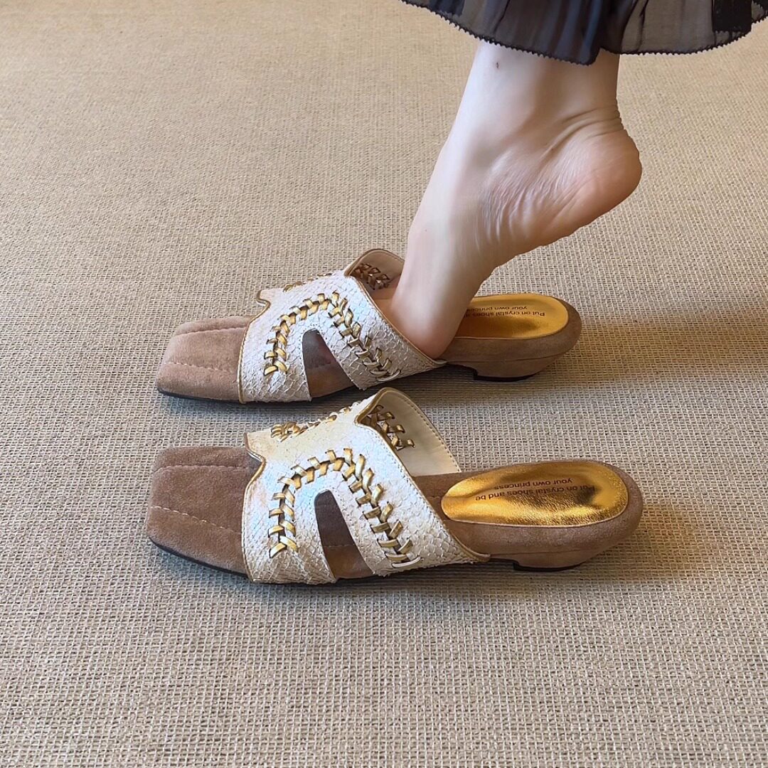 nnmiss/2.5cm小众时尚方头人鱼姬鱼纹编织低跟舒适外穿露趾凉拖鞋