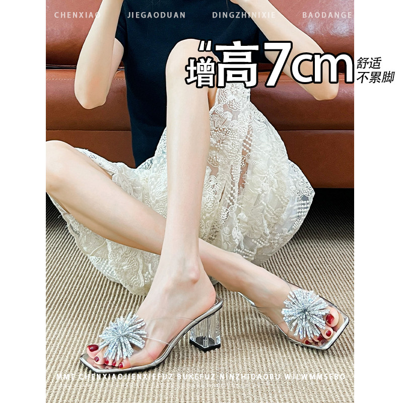 不累脚!增高7CM夏季新款银色方头露趾流苏高跟鞋水晶透明凉拖鞋