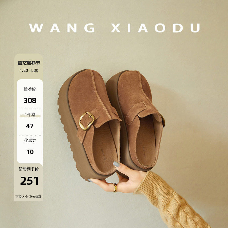 【王小毒】栗秋○6.5cm厚底勃肯拖鞋女秋冬绒面魔术贴半拖包头拖