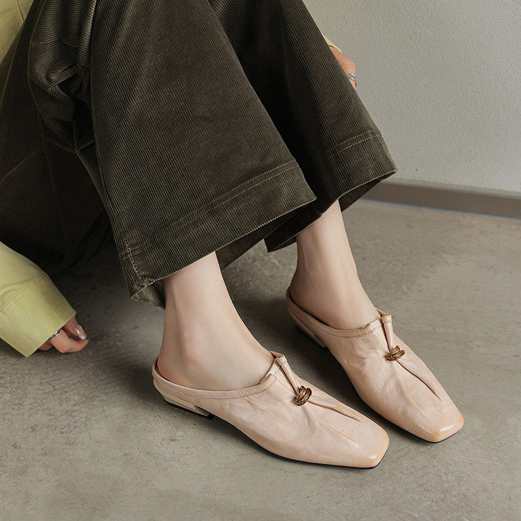 通勤风真皮羊皮包头拖鞋女夏外穿粗跟一脚蹬穆勒鞋金属扣百搭新品