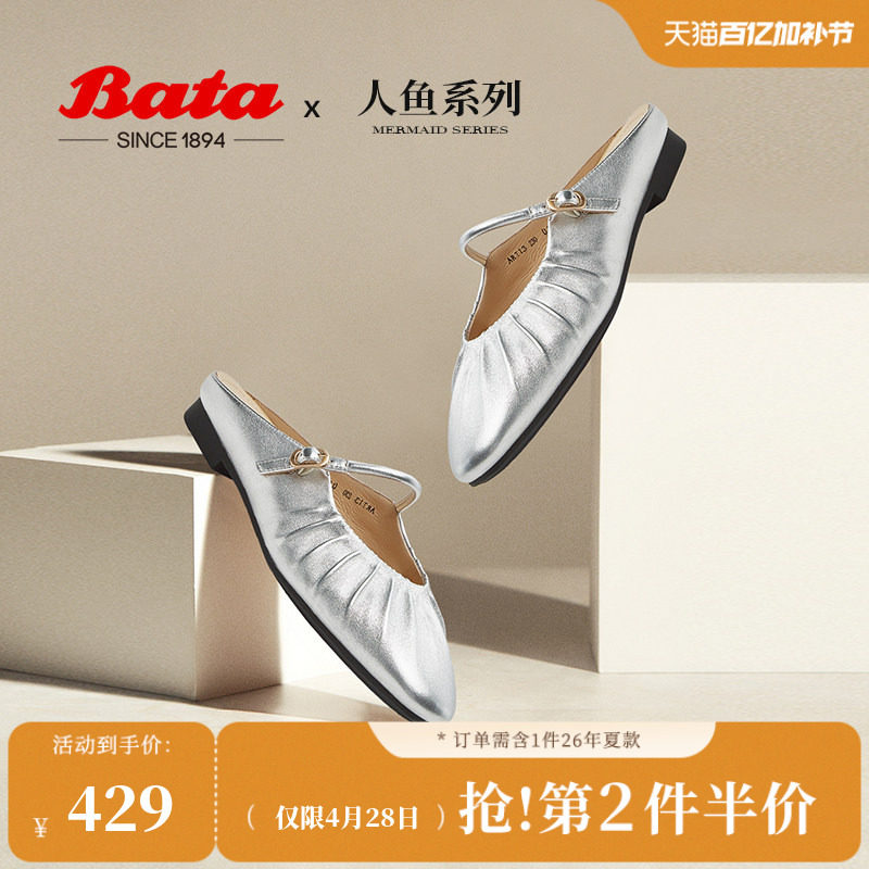 Bata人鱼玛丽珍拖鞋女春秋商场羊皮软底一脚蹬半拖ART13AH4