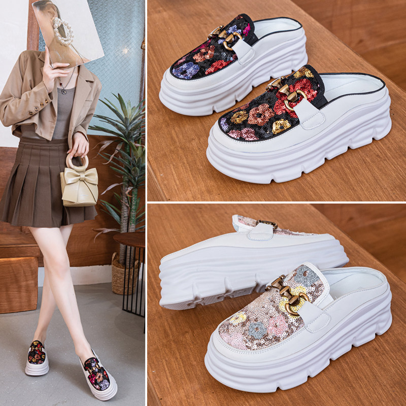 真皮亮片花朵爆款半拖鞋女增高6cm春夏新款松糕厚底外穿包头凉拖