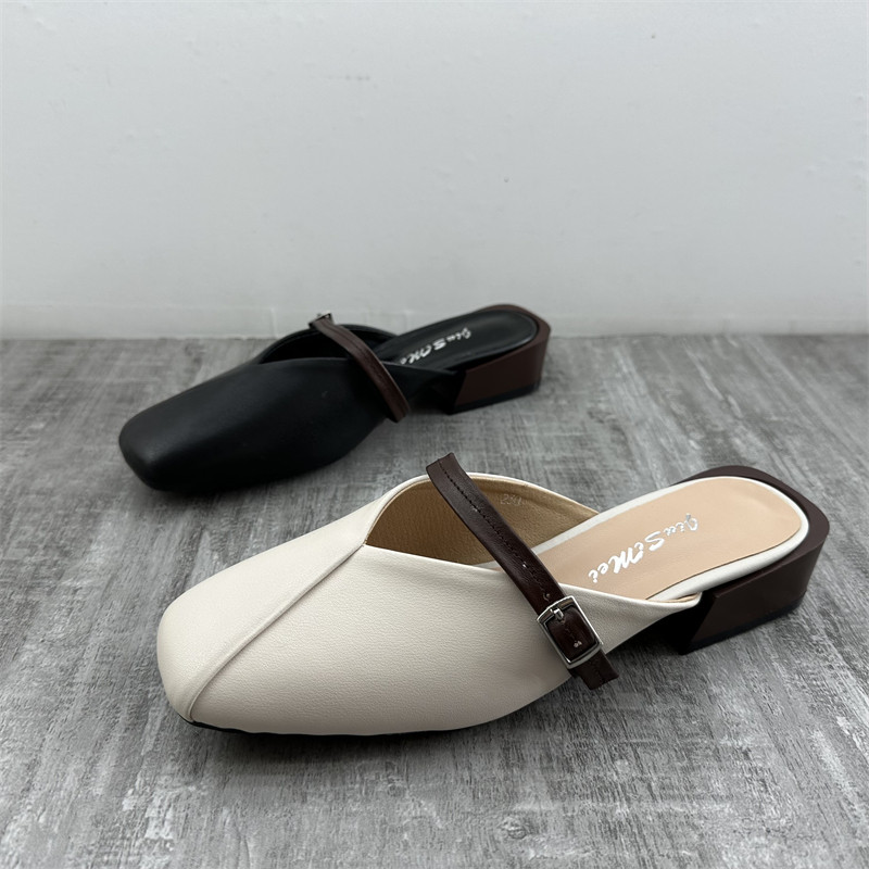 断码处理2023夏款真皮女鞋英伦风皮带扣包头低粗跟牛皮懒人半拖鞋