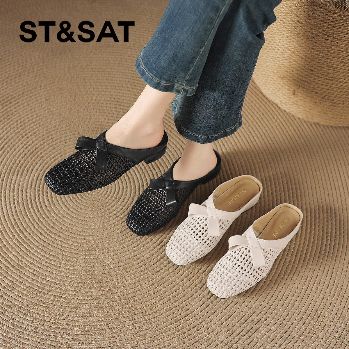 星期六拖鞋女款外穿新款夏夏季编织镂空单鞋粗跟穆勒半拖凉鞋