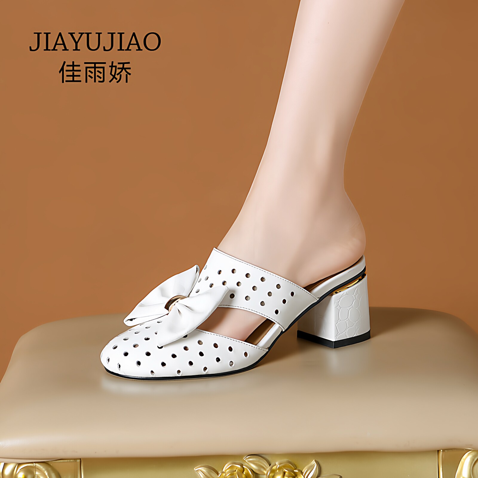 半拖鞋女新款包头中跟凉拖鞋真皮粗跟皮拖蝴蝶结外穿懒人拖洞洞鞋