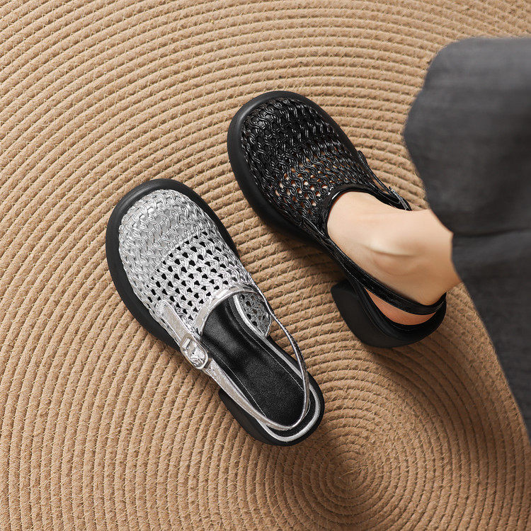 踩屎感银色镂空洞洞鞋编织罗马凉鞋女低跟包头透气舒适百搭拖鞋女