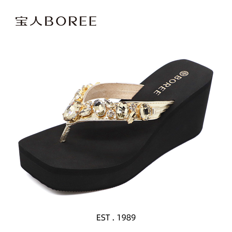 宝人夹脚人字拖坡跟夏季感水钻夹脚拖鞋外穿防滑增高时尚凉拖鞋