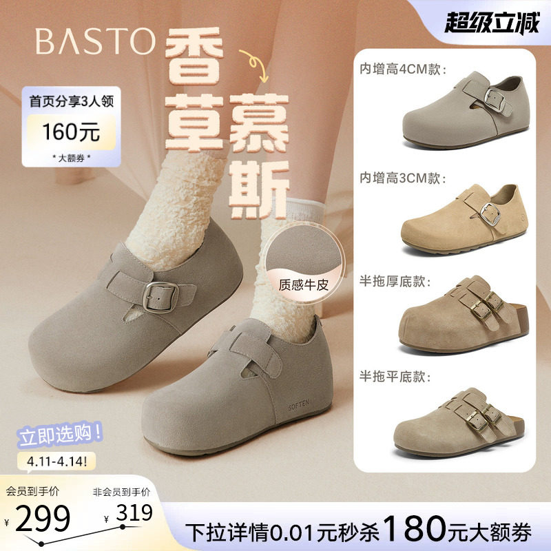 【香草慕斯】百思图26春商场新款真皮厚底外穿勃肯拖鞋单鞋增高女