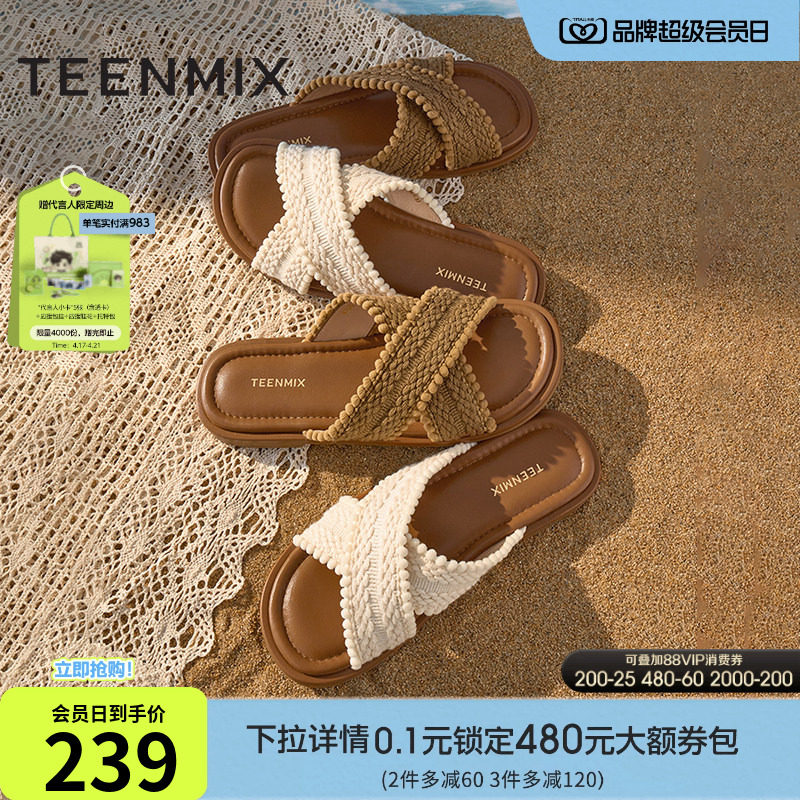 天美意一字拖编织度假平底拖鞋女外穿休闲凉鞋夏季新款KT072BT5