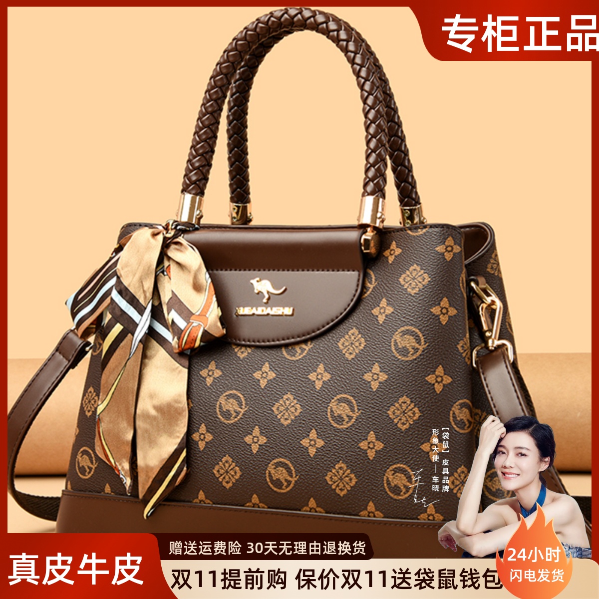 萱羽袋鼠女包2025新款中年手提包真皮包包女妈妈包百搭牛皮斜挎包
