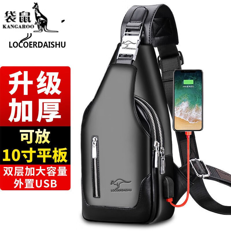 袋鼠款男士斜挎包高档帅气单肩多功能防水包出差软皮包大容量胸包 【升级-可充电】黑色防水包
