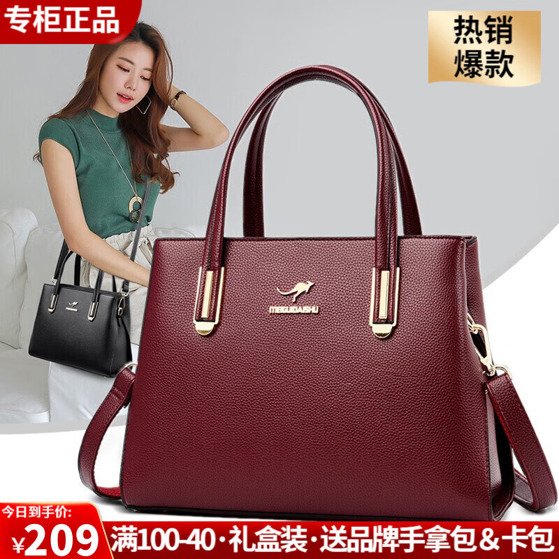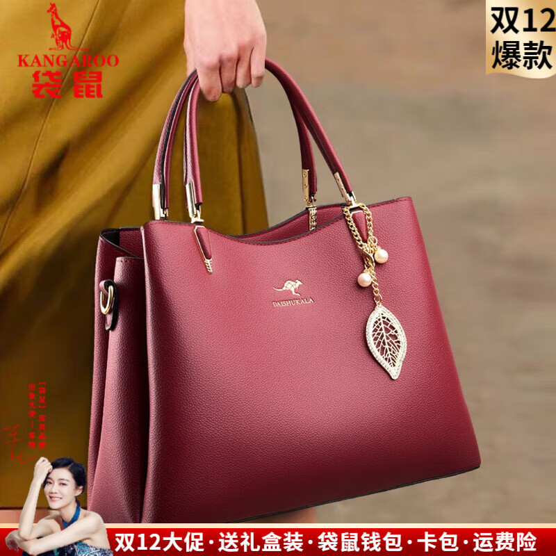 袋鼠卡拉结婚送品牌包包女包轻奢牛皮包2025新款手提包送妈妈婆婆斜挎婚包 酒红色(礼盒装+手包卡包吊坠)