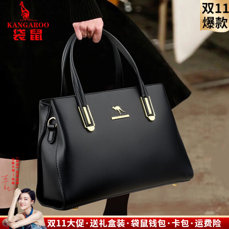 袋鼠品牌中年妈妈手提包真皮包包女包2025新款时尚牛皮斜挎包红色婚包 黑色(礼盒+手包卡包)