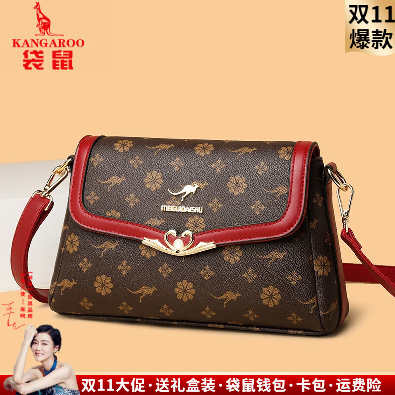 袋鼠卡拉品牌包包女包斜挎牛皮包2025新款女式真皮包母亲节送妈妈生日礼物 棕玫瑰配红(礼盒+手包卡包)