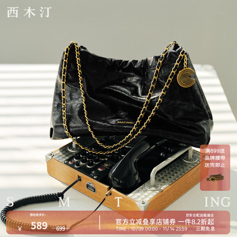 西木汀 悠途 头层牛皮包包新款女托特包小个子大容量链条包 深邃黑中号